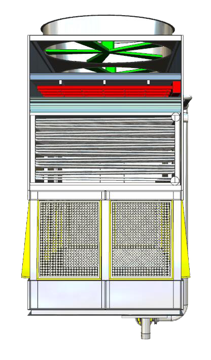 逆流閉式冷卻塔的進(jìn)風(fēng)形式為底部逆流進(jìn)風(fēng),與下落的噴淋水逆向交替形成飽和濕熱空氣,熱量由頂部風(fēng)機(jī)排出,水分由特殊結(jié)構(gòu)的收水器檔回集水槽循環(huán)使用,內(nèi)部空間沒有預(yù)冷散熱的填料或設(shè)置少量填料,余出更過的空間來增加盤管的散熱面積,結(jié)構(gòu)緊湊,占地小。特別適用于溫度較大的流體冷卻。